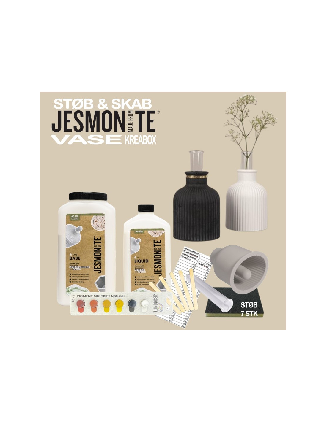 Startboxen indeholder : 2500 g jesmonite pulver og 1000 ml væske, 5 X 2 g Jesmonite pigmenter, Kvalitets silikoneform incl 1 reagensglast i plast, 5 trærørepinde,1 slibesvamp og Jesmonite blandingsvejledning.100