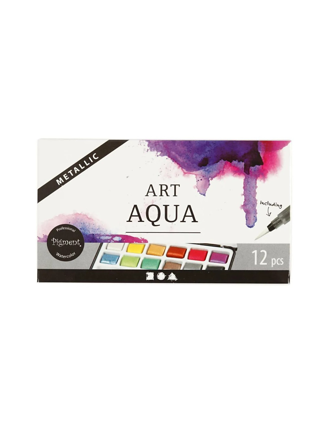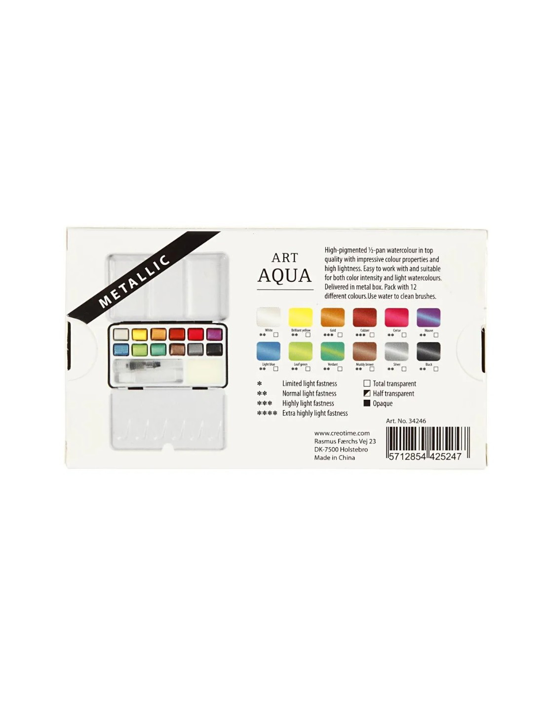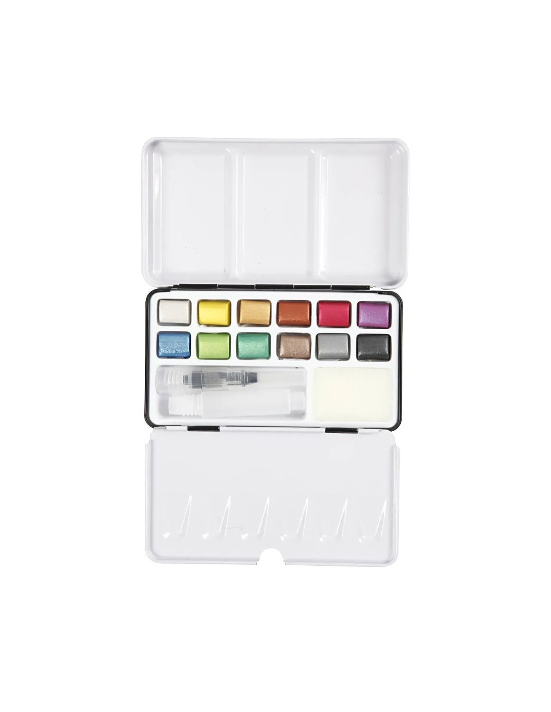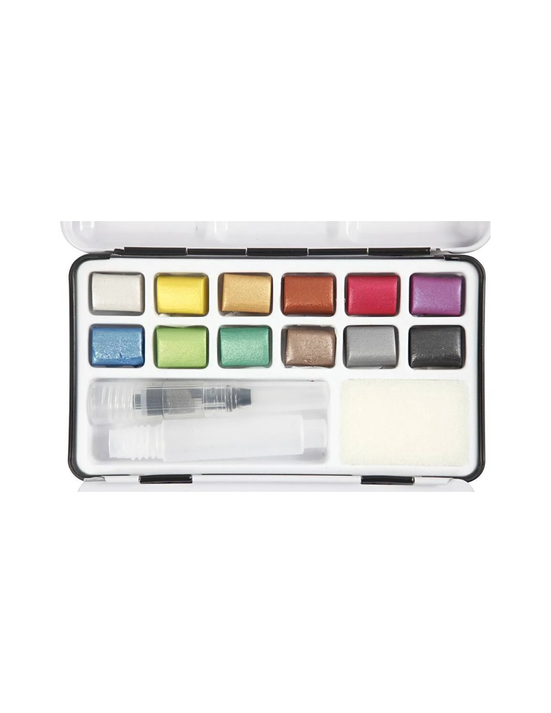 Sættet indeholder 12 højpigmenterede farver, 1 vandpensel og 1 svamp – alt samlet i en lækker metalæske. Farverne er i topkvalitet med flot farvestyrke og høj lysægthed. Nemme at arbejde med, uanset om du maler intenst eller let og luftigt.