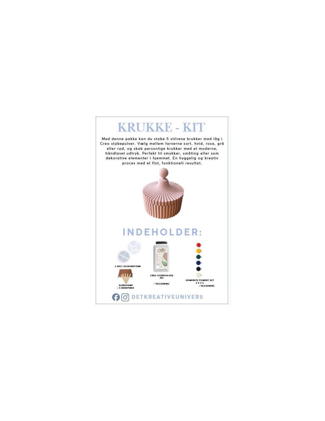 Med denne pakke kan du støbe 5 stilrene krukker med låg i Creo støbepulver. Vælg mellem farverne sort, hvid, rosa, grå eller rød, og skab personlige krukker med et moderne, håndlavet udtryk. Perfekt til smykker, småting eller som dekorative elementer i hjemmet. En hyggelig og kreativ proces med et flot, funktionelt resultat. Indeholder 1 kg creo støbepulver, silikoneform, 6 pigmenter, slibesvampe og rørepinde samt vejledning