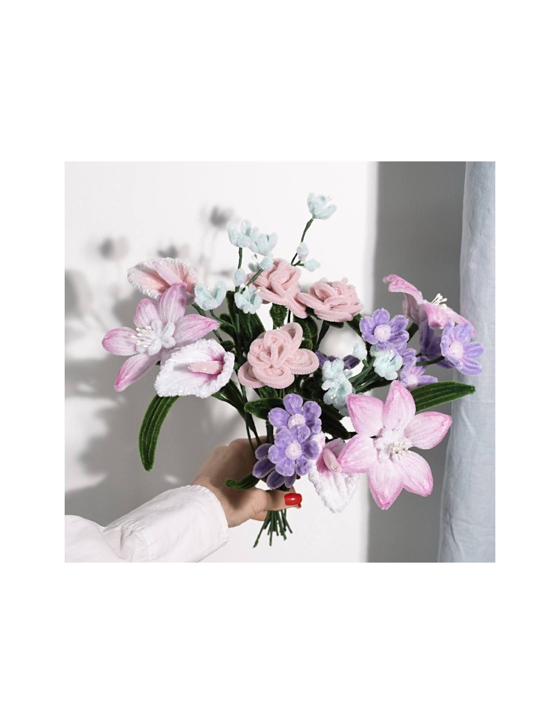 Lav din egen smukke, pollenfri buket med blød chenille (piberensere)! Sættet indeholder chenille, blomsterstængler, blomstertape, støvdrager, stempelfarve og svamp – du skal kun have en limpistol og bidetang klar.