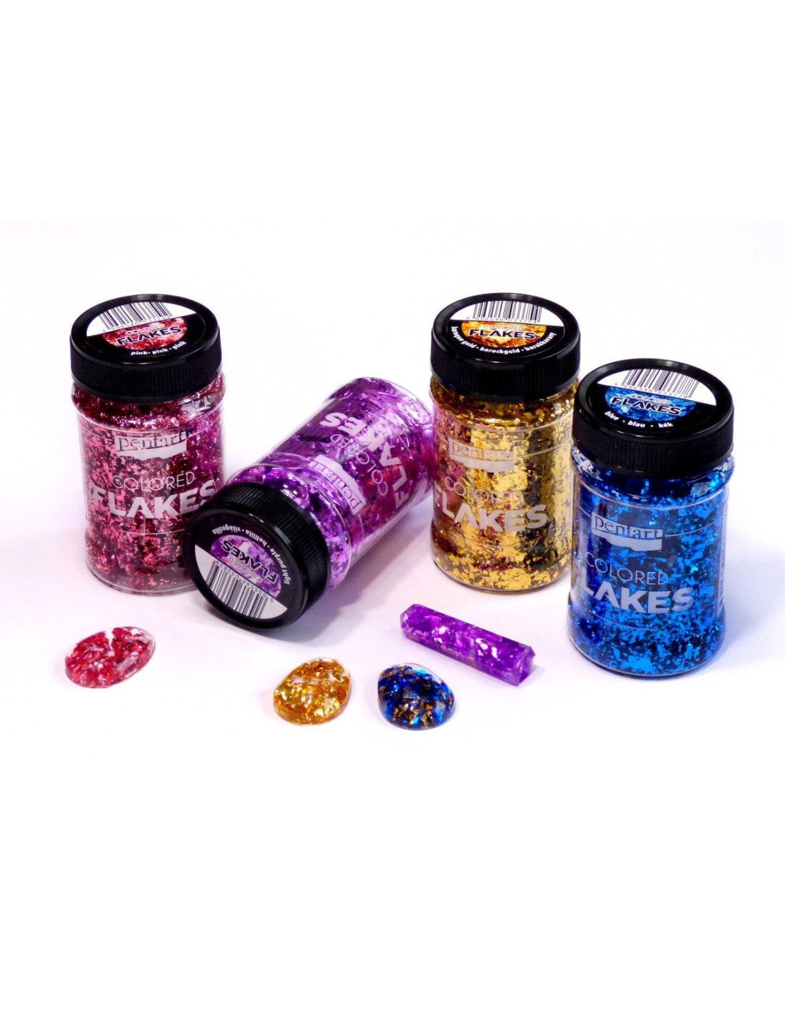 Farverige metallic flakes til flotte effekter. Pensel den ønskede overflade med lim og vent til limen er blevet gennemsigtig. Drys nu de fine flager på og fordel dem med en pensel. Med en tør børste kan du tørre de overskydende flager af, og du har en smukt skinnende overflade, også velegnet til dekoration i resin eller på dine scrapping emner. Indeholder 100 ml
