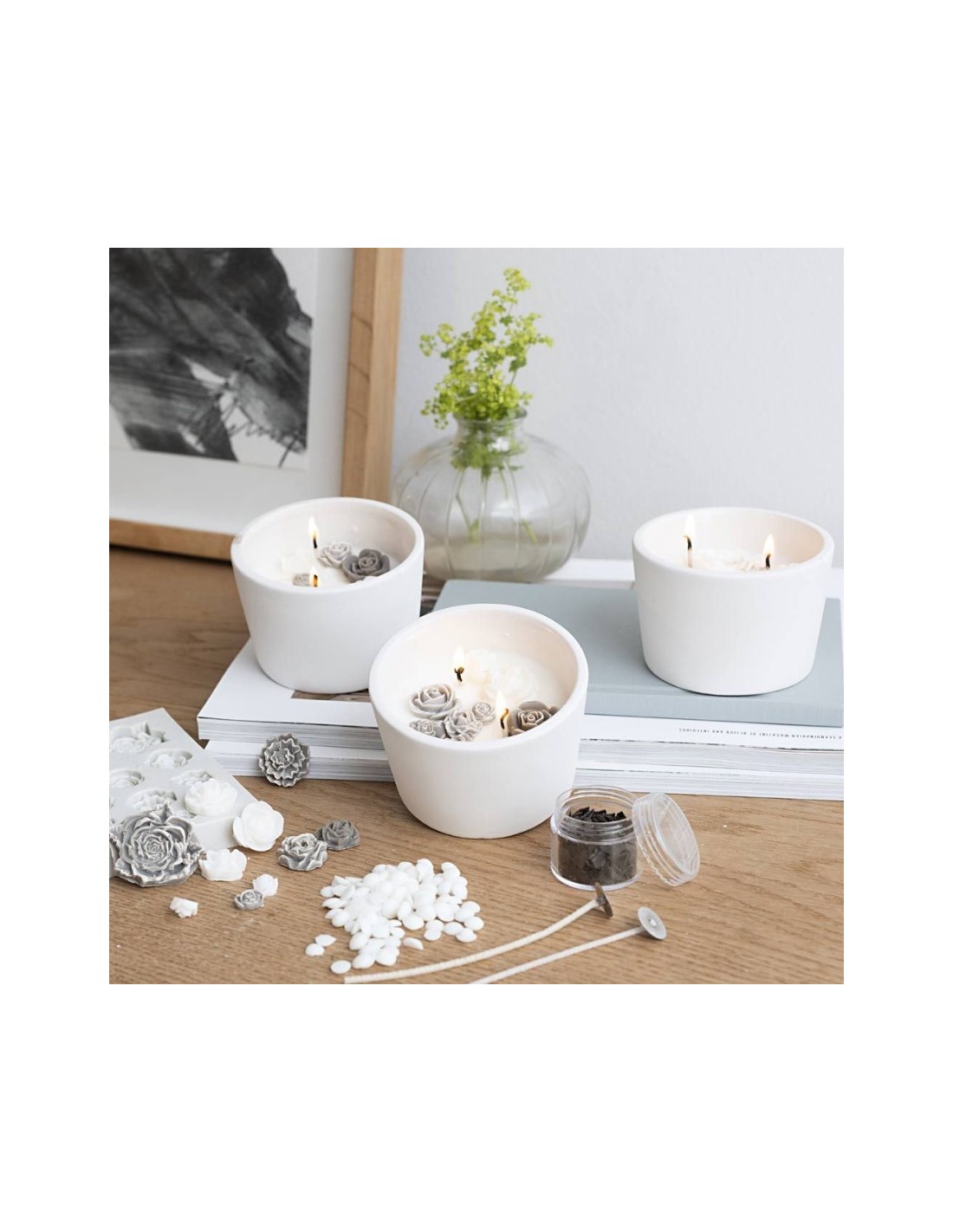 Soyavoks, lysfarve, væger, terrakottaskåle og silikoneform med roser.