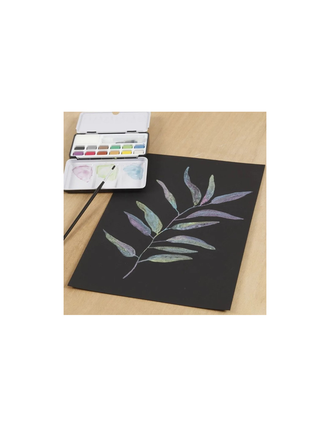 Perfekt til lyse og metalliske farver, som virkelig træder frem på den mørke baggrund. Papiret har en struktureret overflade og er velegnet til akvarel, gouache, tør- og oliepastel samt linoleumstryk.