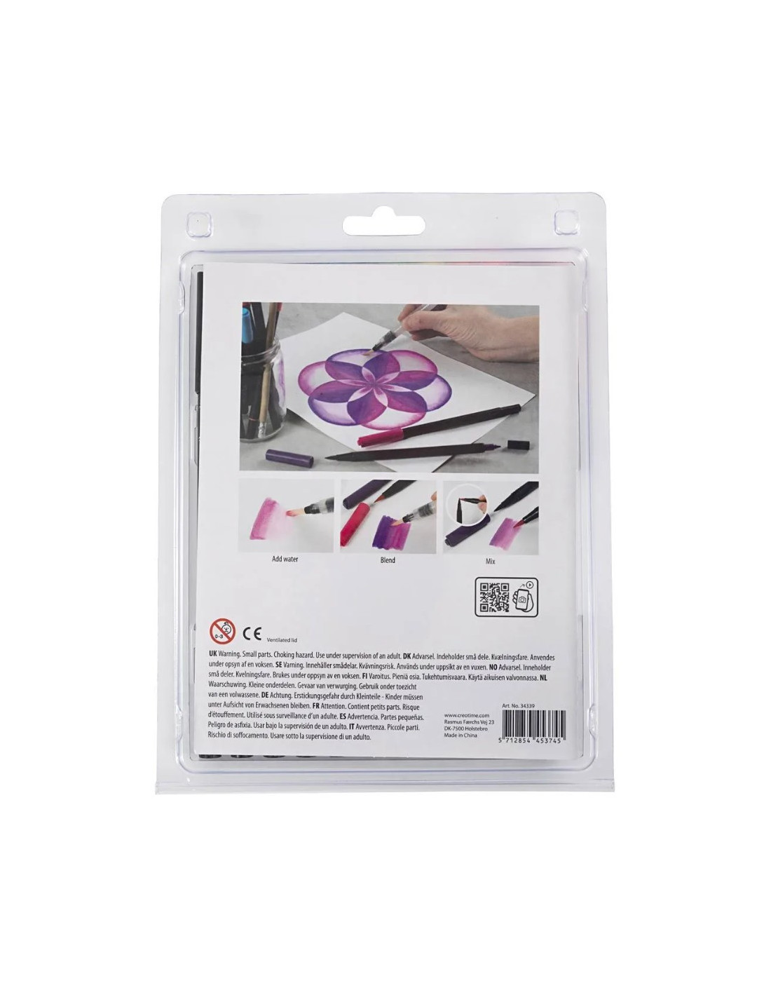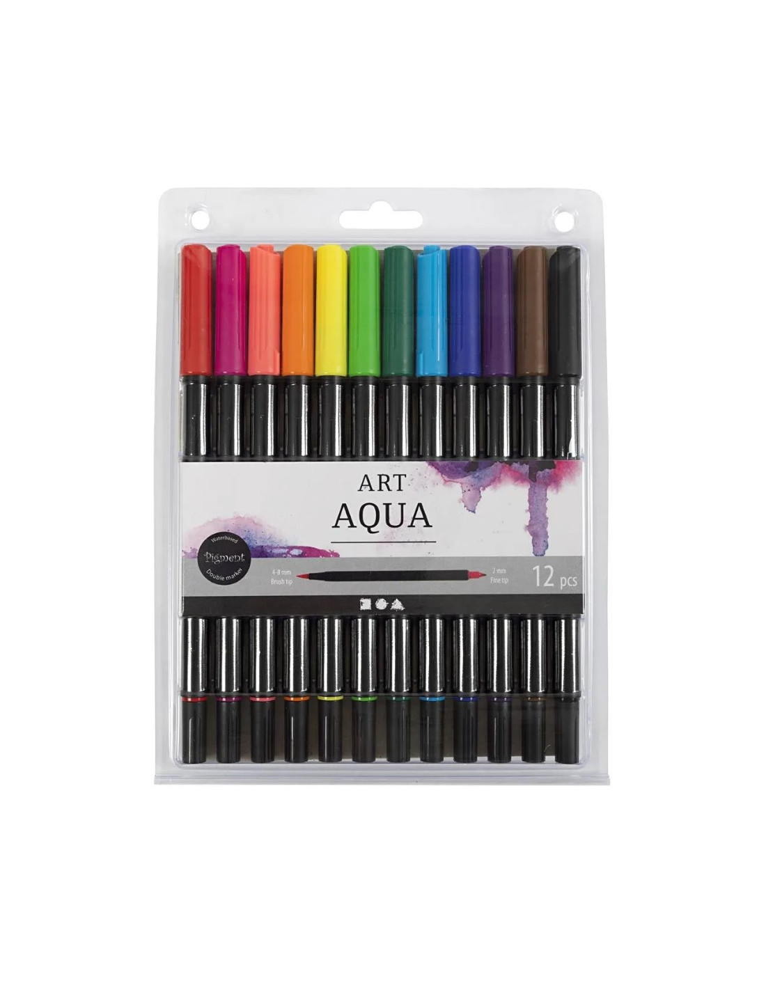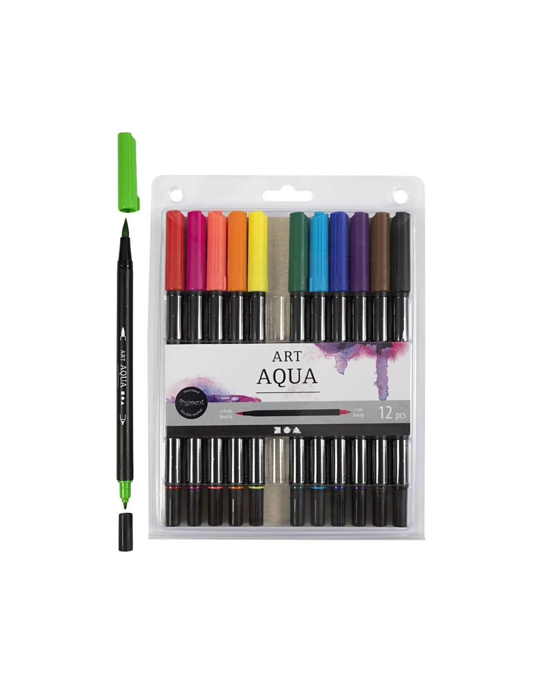 Sæt med 12 vandbaserede akvareltuscher i standardfarver – perfekte til farvelægning, lettering og kreative illustrationer. Hver tusch har dobbeltspids: en fleksibel penselspids til flotte strøg og en hård filtspids til fine detaljer.