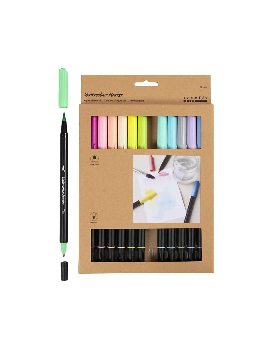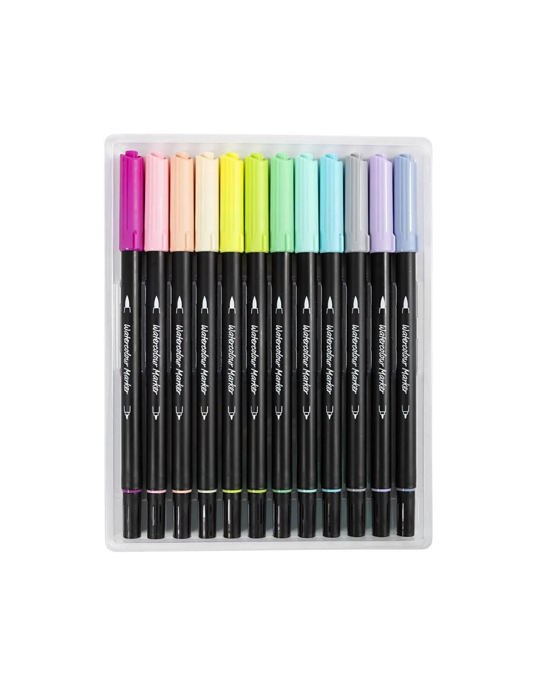 sæt med 12 vandbaserede akvareltuscher i skønne pastelfarver. Hver tusch har dobbeltspids: en fleksibel penselspids til varierende stregtykkelser og en hård filtspids til præcise detaljer. Perfekt til både nybegyndere og øvede.
